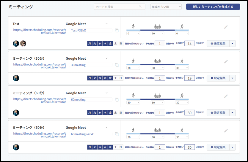 面接での日程調整ツールを利用する場合、膨大な予約カード(面接用URL)を作成する必要があります。ダイレクトスケジューリングでは、一画面で、簡単な情報は設定できるので、日程の条件変更を瞬時に変更することができます。